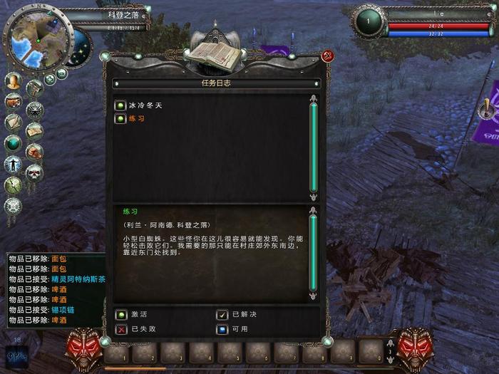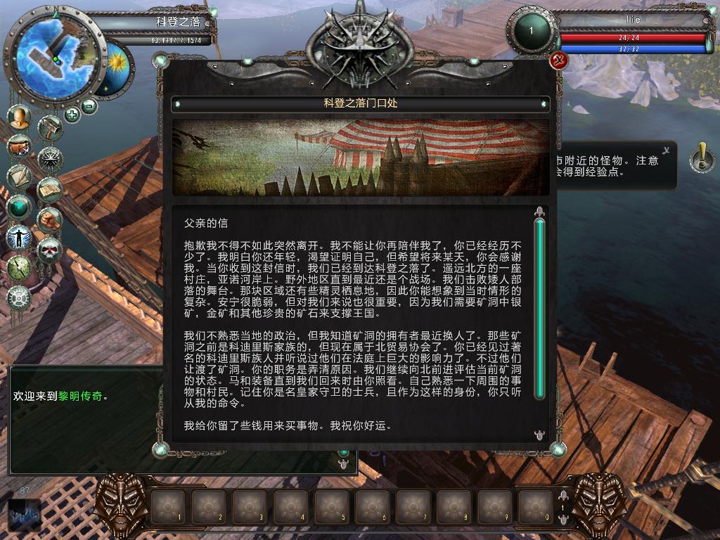 国王的信,看完了之后,我们就要进入游戏里,首先玩家要上船去拿在角落位置的包裹,有红瓶儿的绿瓶儿的,还有一把匕首回去找兰利,他会让玩家到村子里面去买酒,这里先说一下,这个游戏里的,几个按键方向键WASD任务Q地图M旋转视角右键拖动即可,在城里有很多箱子玩家是可以打开的,甚至可以私闯民宅,翻人家的柜子,会得到一些好东西,这些地方有时候会捡到一种符文,这是以后建立魔法技能用的,所以都可以留着,玩家可能会问,其实这就是这个游戏的有一变态之处,