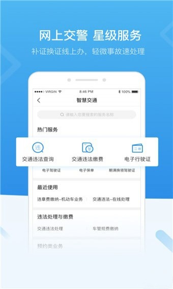 2、交警星级用户:深圳车主补证换证、异地年审、违章查询、违法缴款、轻微事故远程处理等一键办理;驾驶证、行驶证、保单电子化,掏出手机随时验。