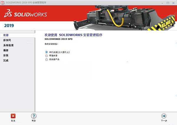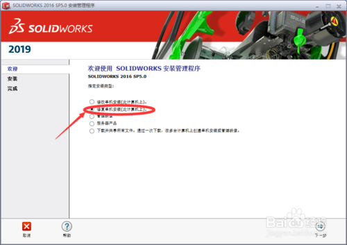 4、断开正在连接的网络,然后解压安装文件“SolidWorks.2019.SP0.Full.Premium.DVD.iso”压缩包,双击运行“setup.exe”启动安装程序进行软件原版安装,弹出界面,选择“单机安装”