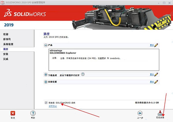 6、点击“我接受SolidWorks条款”同意软件相关许可协议,并点击“现在安装”开始安装软件