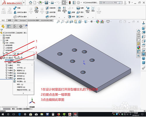 1在设计树里面打开异型螺纹孔的下拉菜单;2右键点击第一幅草图;3点击编辑此草图。