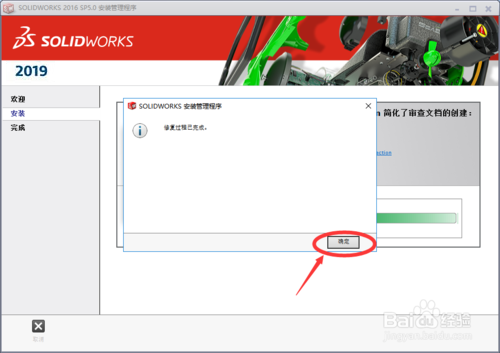 修复完成后会弹出提示“修复过程已完成”,点击确定后SolidWorks软件的修复过程就完成了。