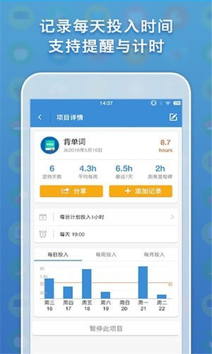 1、每日记录在时app记录每天不同项目投入小时数。支持提醒和计时。