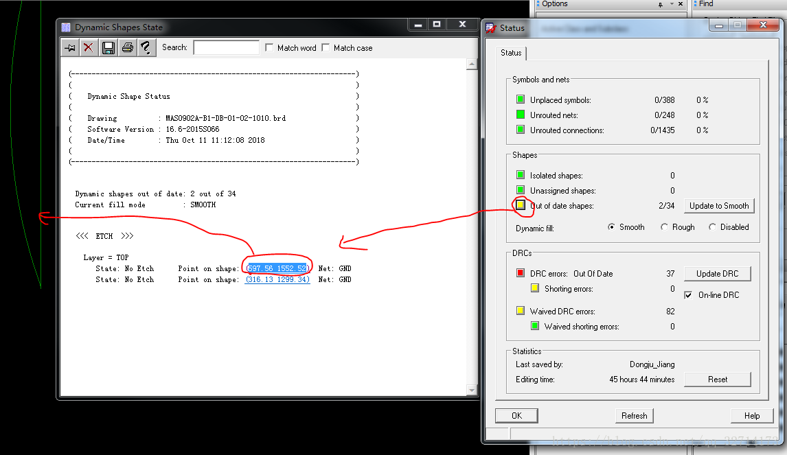 点击out of data shape前面那个小框,会出现对应没删除铜皮的坐标,点击坐标即可跳转到相应的铜皮,删除即可。