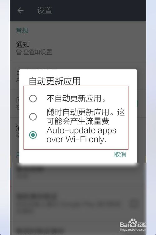 点击设置里面的自动更新,这里有三个选择,不自动更新,自动更新,only WiFi,根据自己的需要进行选择。在这里选择不自动更新。