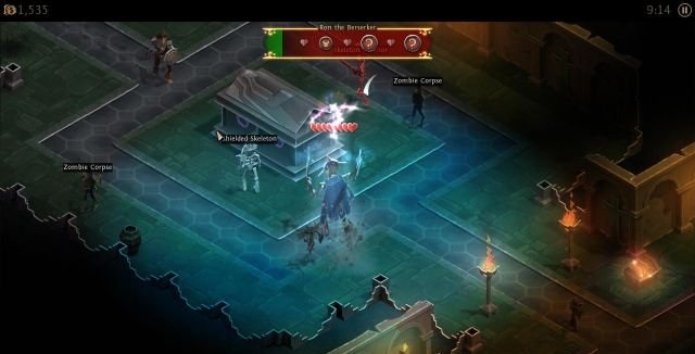 Ron the Berserker开始时,就会召唤丧尸和骷髅兵,这时候你点击一下他们面前的石棺,引发天花板颤动而掉落石块,可以帮你削掉部分杂兵的血量。