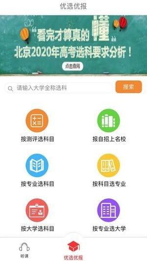 优选优报APP主要用于新高考选科测评,用户可以通过6个版块,分别实现科目,专业,大学的搜索结果。6大功能分别为:按测评选科目,按专业选科目,按科目选专业,按就业选专业,按分数选大学,按专业挑大学。