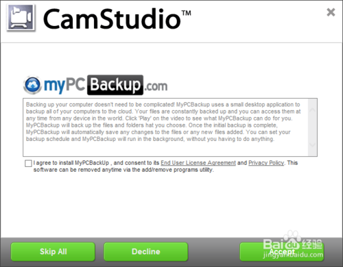 2.这个软件还另附带了另外两个软件,myPCBackup和Norton,你可以同意安装,或者不安装。都不安装的点Skip All.