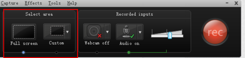3.在Select area中选择Full screen为全屏录制,Custom中可以自定义录制的窗口大小,大家根据录制视频的要求自行设置录制窗口。