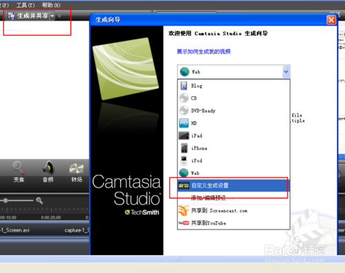 8.然后我们就可以对录制好的视频进行编辑了,编辑好之后点击左上方的“生成并共享”然后选“自定义生成设置”。然后选择自己需要保存的格式(建议选avi格式)。后面的默认下一步就ok了。