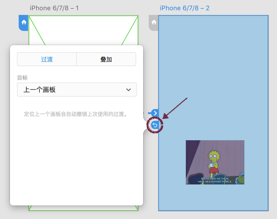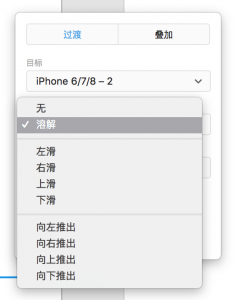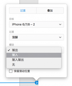 XD中的动态效果有两类,一类是界面之间的跳转,一类是页面内的交互。其中“过度”功能就是实现界面之间的切换跳转。它的操作比较简单,只要选择目标物体,拖拽出一条曲线链接到目标页面上即可完成。