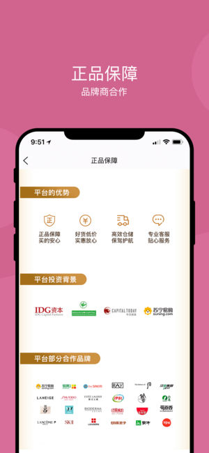1、正品保障:品牌商合作;2、品类齐全:货品丰富应有尽有;