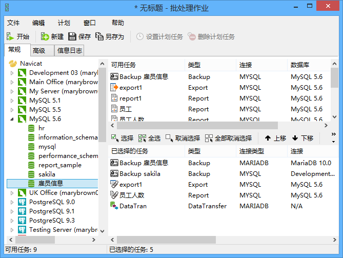 不同的资料库的批次处理任务也可以设定排程并在指定的时间执行。其他功能包括汇入/汇出精灵、查询建立工具、报表产生器、资料同步、备份、工作排程及更多。