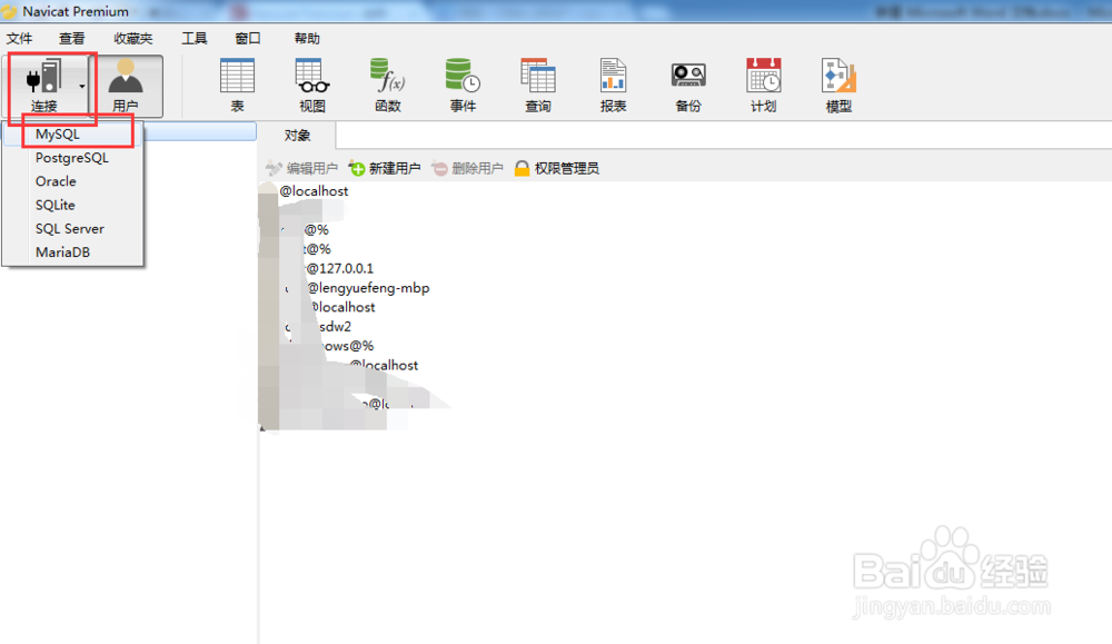 打开Navicat Premium工具,选择要连接的数据库类型,这里选择Mysql数据库,如图所示。