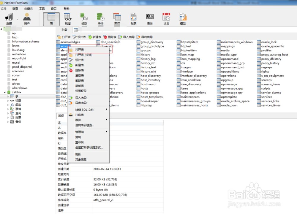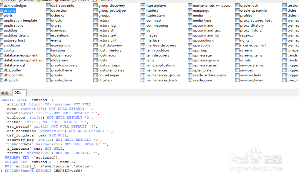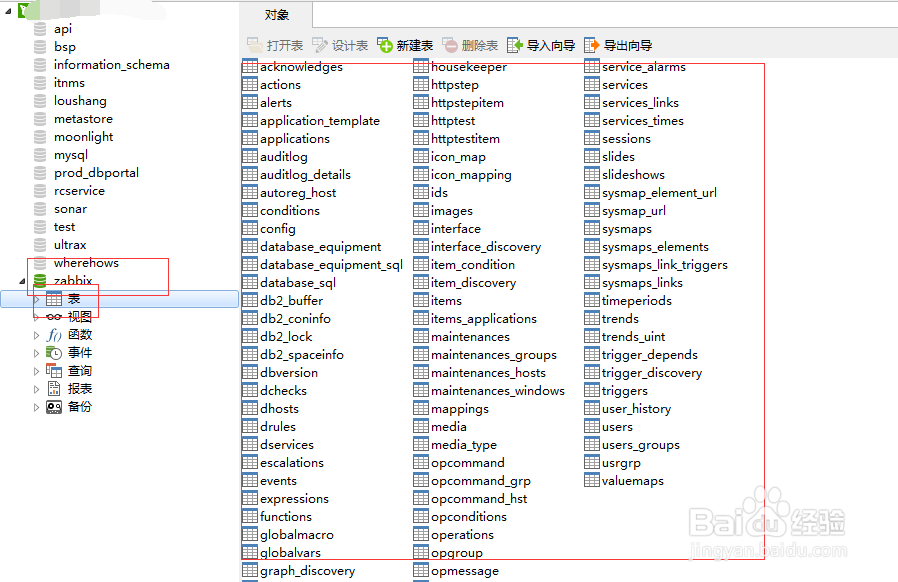 我们双击左侧的连接,选择一个数据库zabbix,然后选择表看到右侧出来所有的表信息。