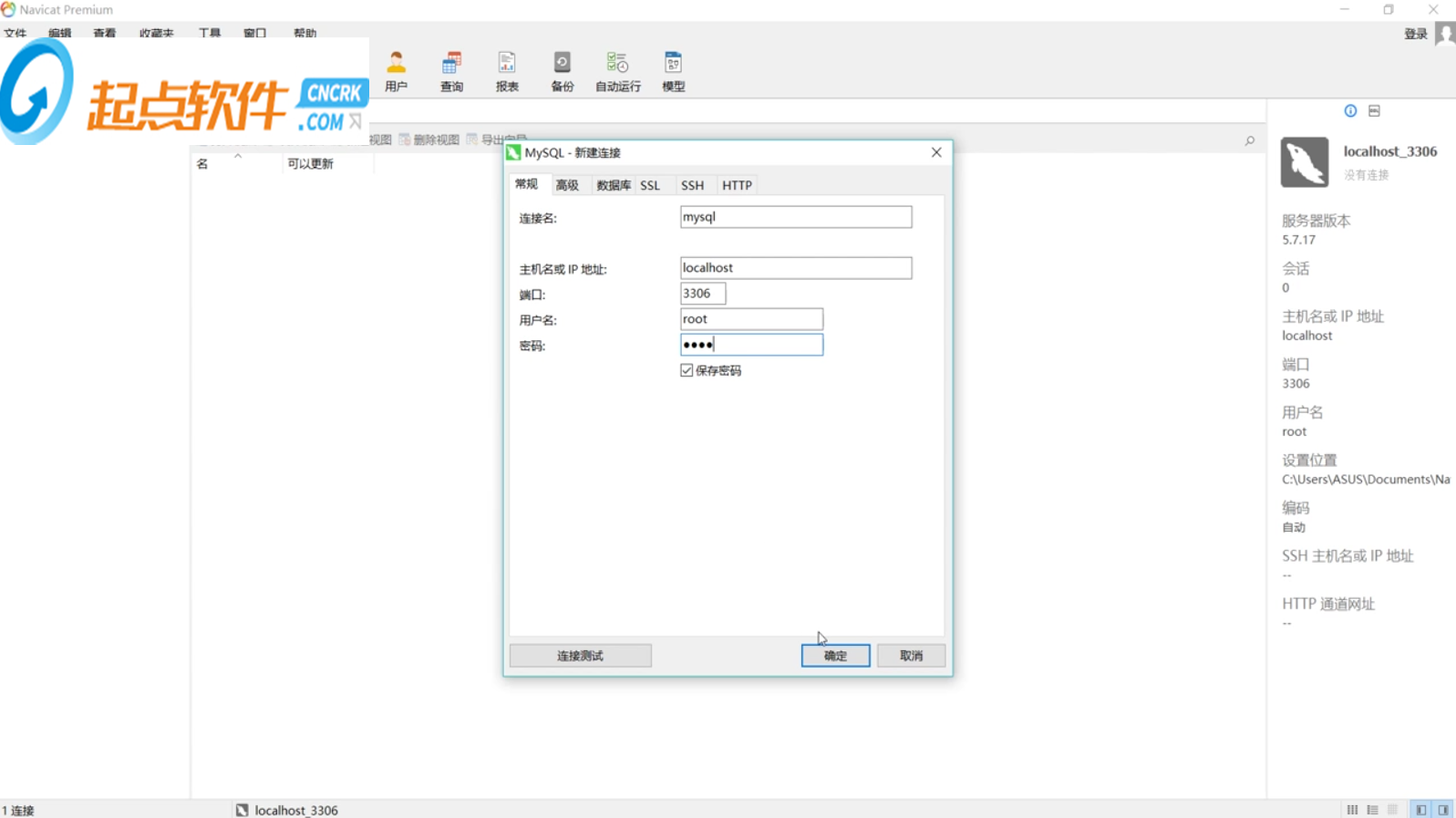 依次选择连接 > MySQL,设置相关的连接信息,点击确定。