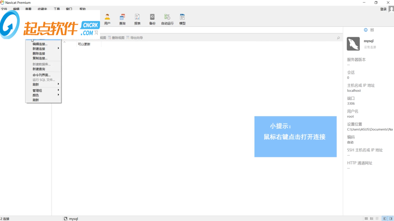 首先打开软件,点击左上角的连接选项,在下拉菜单中点击 MYSQL 。