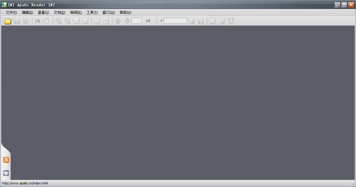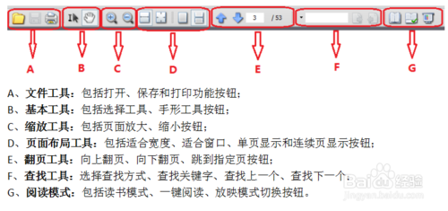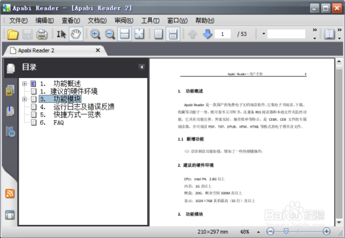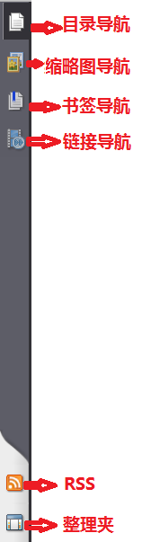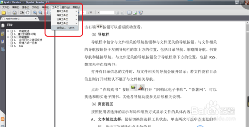 使用Apabi Reader软件打开文件,可以看到该工具中有:标题栏、菜单栏、工具栏、侧边导航栏、页面显示区域以及状态栏