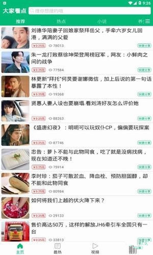 看资讯,赚零花!共享时代来钱快,在大家看点app邀请好友奖现金。大家看点app是一款非常强大实用的新闻阅读平台,为你提供海量热门新闻和资讯,随时随地就可以阅读到不同类型的新闻,