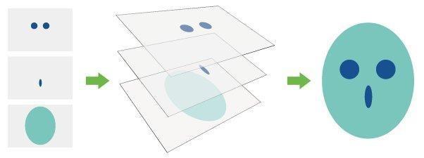 Photoshop的图层功能就像叠在一块的纸。你可以通过图层的透明区域看到下面的图层,也可以移动图层来查看图层上的内容。原理如下图: