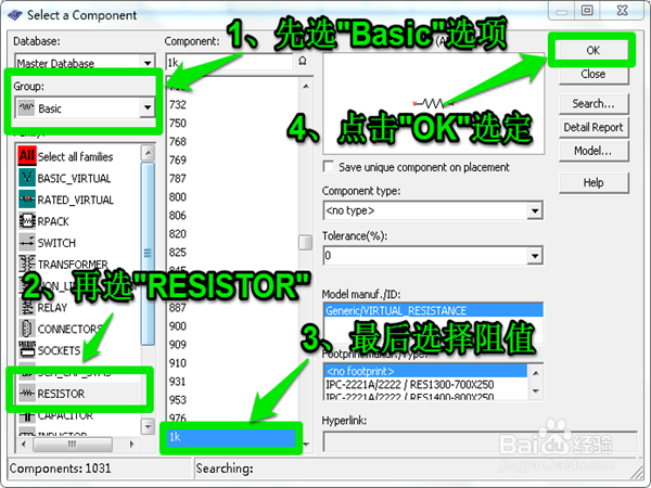 依次选定“BASIC”>>“RESISTOR”>>“阻值”>>“OK”选项,这样就选定了我们想要的电阻,同样的方法,我们可以一次性选够电路要用的电阻。