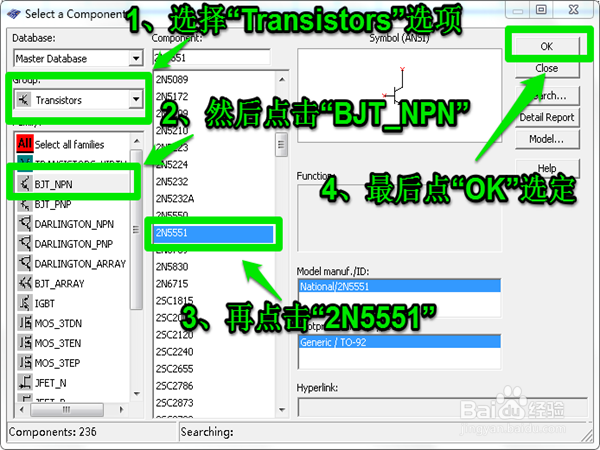 在刚才的界面中依次选定"Transistors">>"BJT_NPN">>"2N5551">>"OK"选定三极管。