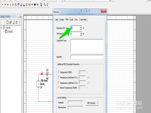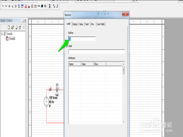 在“Label”选项下箭头所指的地方修改电阻的标签名。同样的方法可以修该其他的元件参数。