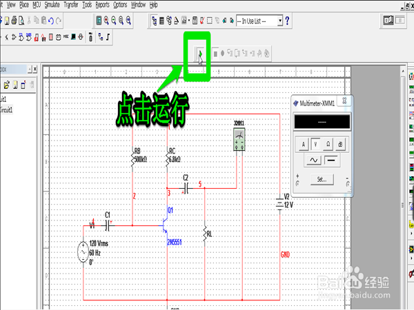 接着按照下图点击图中绿色的箭头,意思是接通电源,此时电路就会开始工作了。