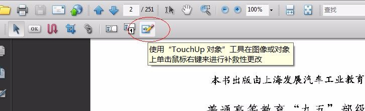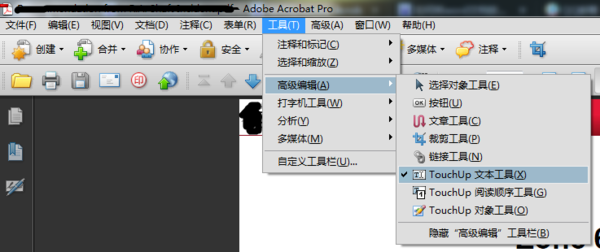 依次点击工具,高级编辑,Touchup对象工具,鼠标图标会变成箭头旁边多一个小方块(图上是把工具加入到了工具栏)
