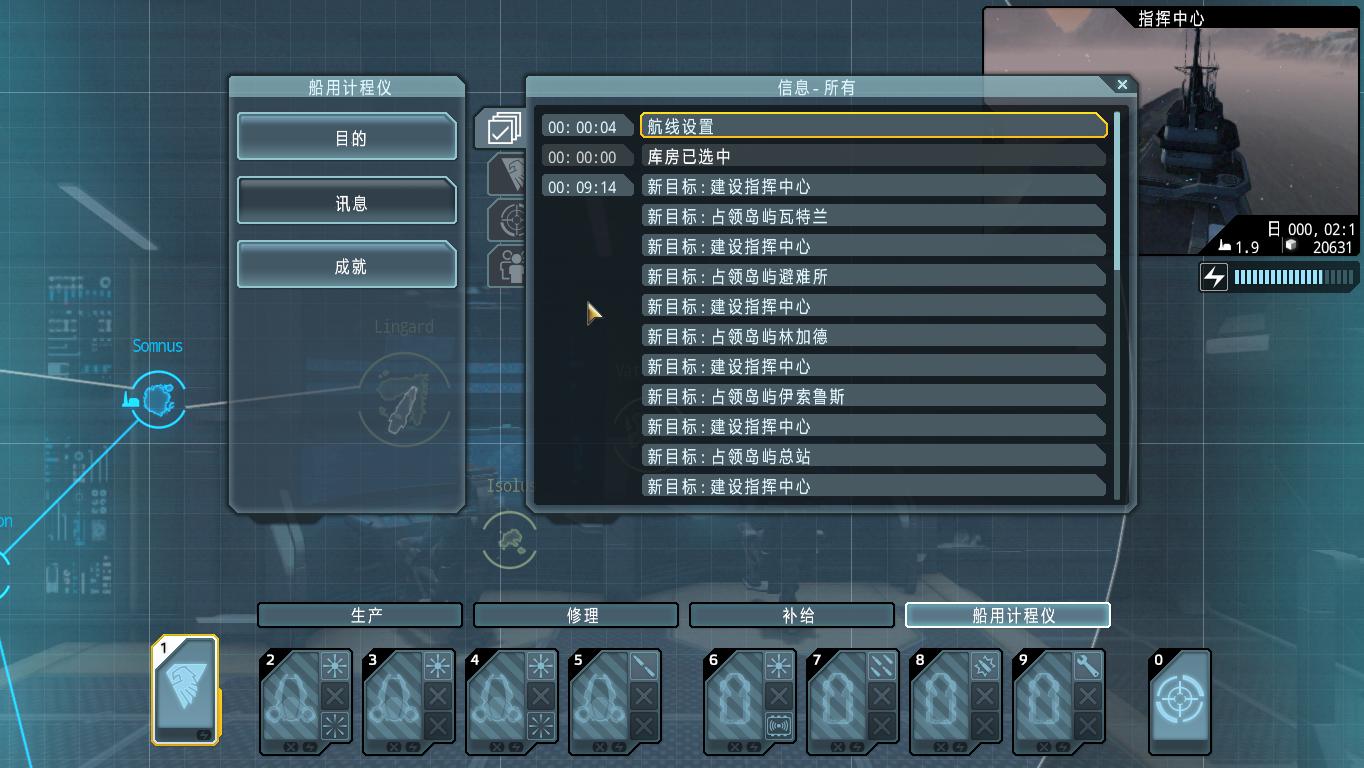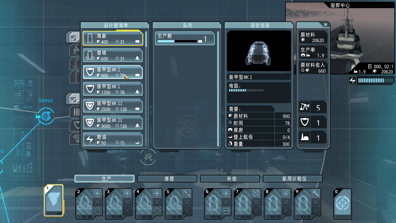 这里开始可以建造燃料和燃料包,航母修理不成问题了。生产力越高,资源越多,你损失的载具和装备就能越快的得到补充。不过,潜艇的容量有限,有时候还不如直接把航母开回去……那样攻略岛屿的任务就会延迟。