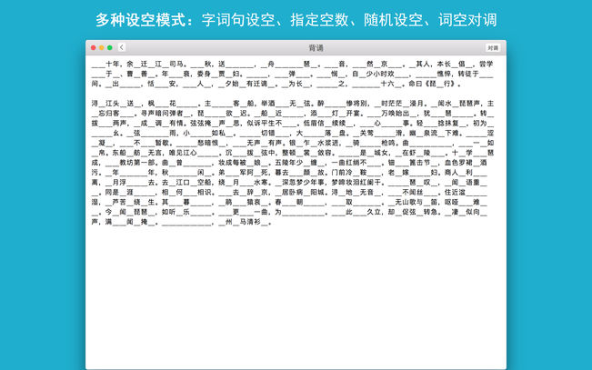 背诵助手官方版是一款教育学习软件,背诵助手Mac版为用户提供空格填写的方式,帮助您从默写中牢牢记住文章。你此外软件内支持双语功能,让您可以按照个人的需要来进行默写。