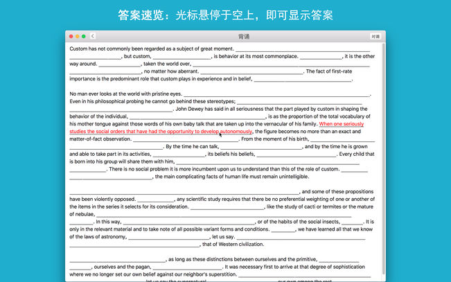 现在,你不用自己动手遮盖要背诵的内容,把这份枯燥的活交给《背诵助手》吧!它可以用多种方式自动帮你设空,你只需对着设空后的文本不断地练习背诵,直至滚瓜烂熟,倒背如流。如果遇到想不起来的空,鼠标悬停即可显示答案。