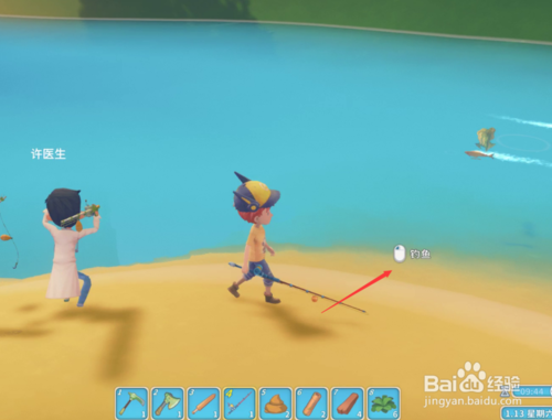 我们先走到岸边不要太靠近,也不要太远,走到出现鼠标的位置之后左键