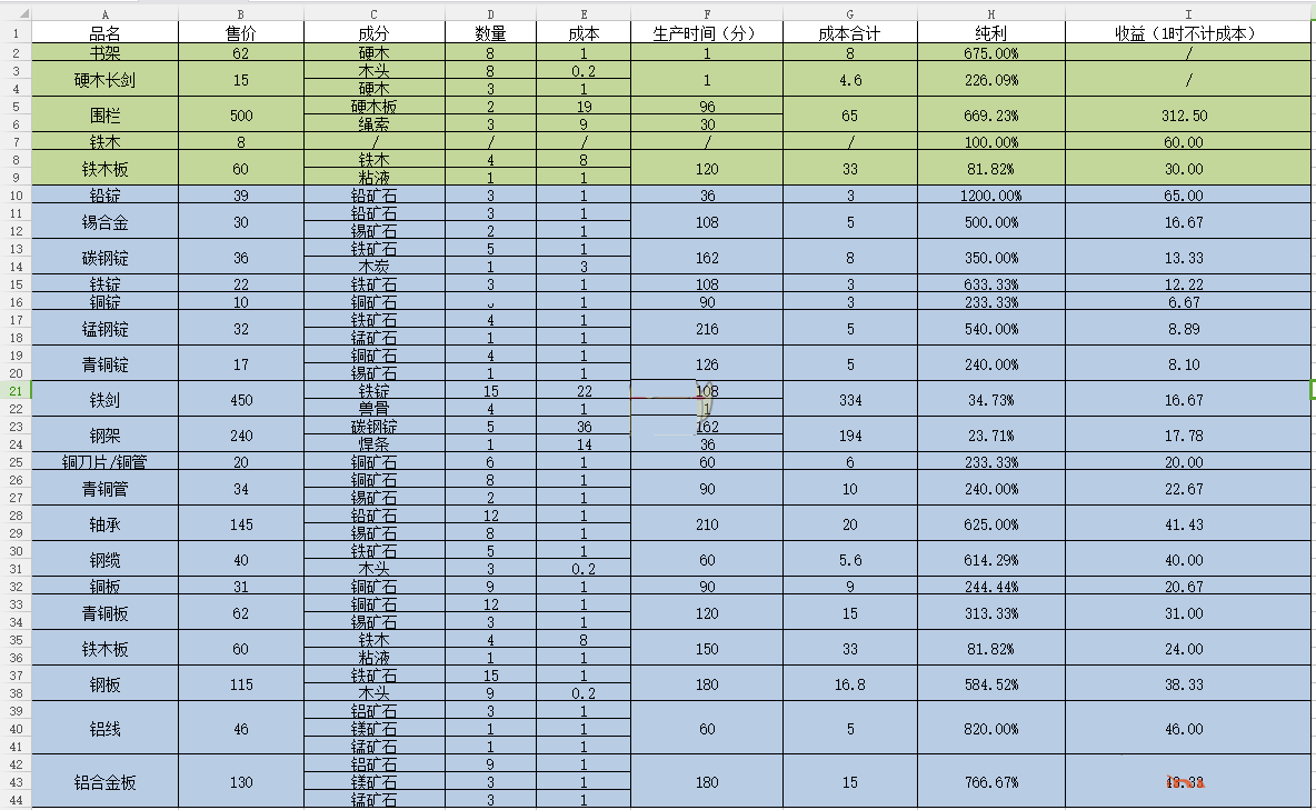 首先,铅锭是效益最高的,材料3个矿石,仅用游戏时间36分产成,售价39G,所以锡合金不考虑了。