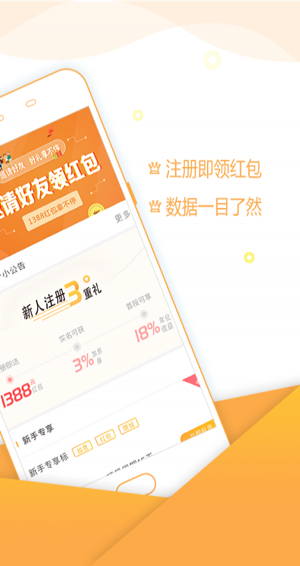 新手专享——18%新人专享高息标,注册即送1388元红包,实名再送3%加息券邀请豪礼——邀友投资齐享红包大礼,多邀多得。