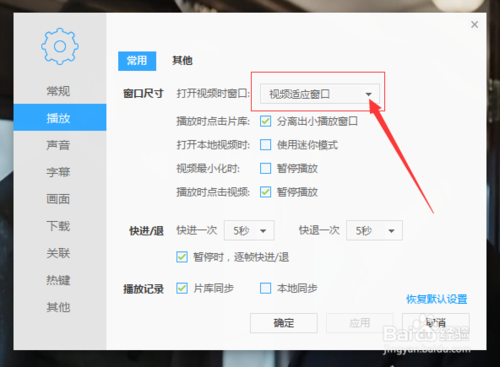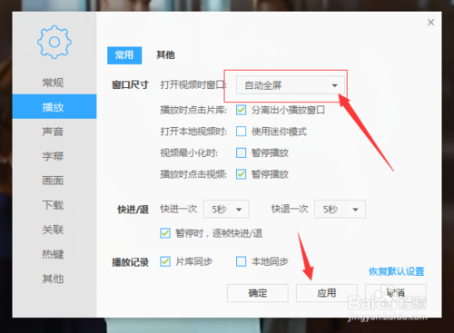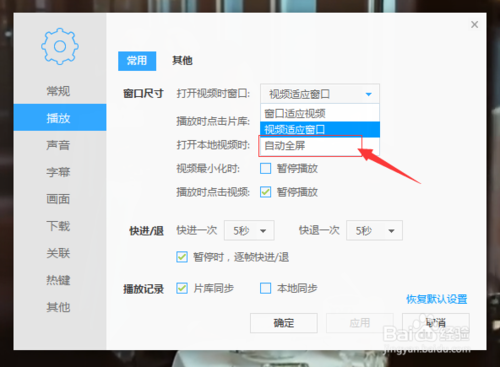 可以看到打开视频时窗口的已经设置为了自动全屏的选项了,然后进行点击应用的选项。