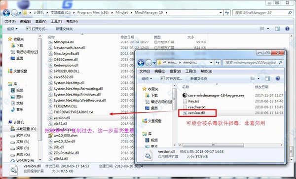 10、把文件包中的“version.dll”复制到软件安装【C:\Program Files (x86)\Mindjet\MindManager 19 】下,这一步至关重要,文件包中的破解文件肯会被杀毒软件报毒,如不信任勿用。