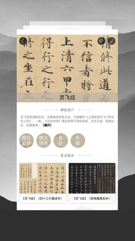 鉴于此,临池轩书法app整理碑帖时尽量加上了释文、版本着录等,给书法研习者提供更深入详尽的信息,让碑帖呈现出一种立体感。