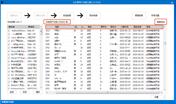 软件自动过滤重复QQ,性别、入群时间、发言时间、积分、Q龄这些都能提取。