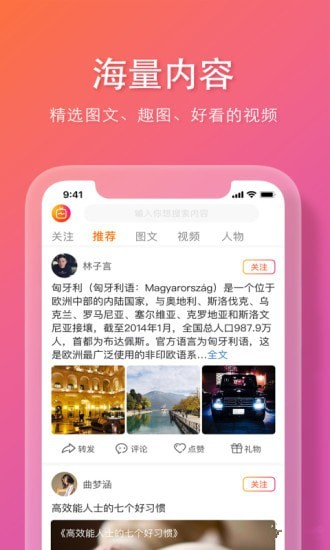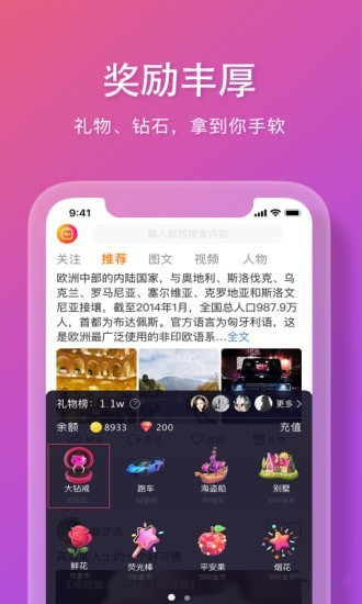 海量内容:精选图文、趣图、好看的视频奖励丰厚:礼物、钻石,拿到你手软