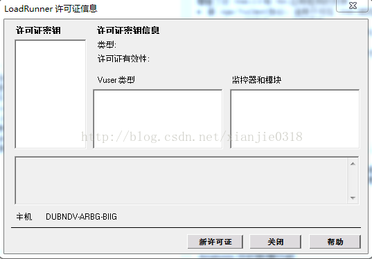 7.再次打开程序, c配置—>loadrunner许可证->新许可证,在弹出的输入框中输入license序列号AEABEXFR-YTIEKEKJJMFKEKEKWBRAUNQJU-KBYGB