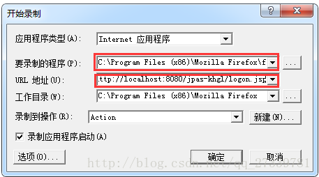 3、弹出start Recording窗口,选择对应的录制类型(Internet Applications),选择浏览器(这里我们选择Firefox24.0),选择需要测试的web地址,选择浏览器安装地址。点击ok(如遇乱码问题,点击选择—HTTP属性的高级—支持字符集—UTF-8)