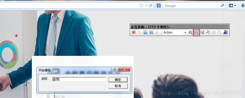 4、自动打开浏览器,进入相对应地址,在页面上方显示一个录制工具条。此时我们发给服务器的所有请求都会被记录在脚本中。输入用户名和密码,在点击登录前插入事务,输入事务名称,点击ok