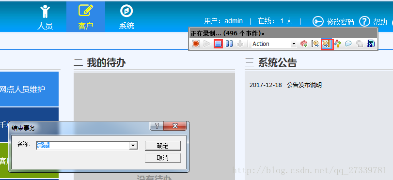 5、然后点击登录按钮,待登录成功,显示出成功页面后,点击结束事务,再点击确定。然后点击工具条上的停止按钮。结束录制,回到脚本中。