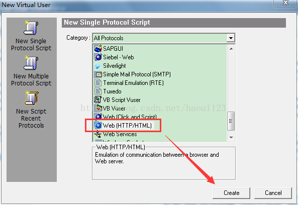 2、在弹出框中选择Web(HTTP/HTML)协议,然后点击创建按钮