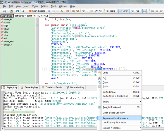 将登录的用户名密码进行动态化,右键“Replace with a Parameter”,将其替换为一个参数,后期进行压力测试时,会有很多用户,可以进行动态修改。