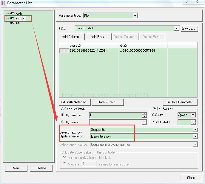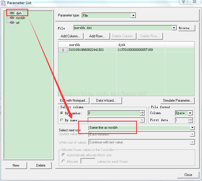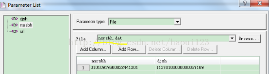打开Parameter List,后期可以传入一个.dat文件,将上万条数据存在文件里,脚本回放时可以直接循环调用。