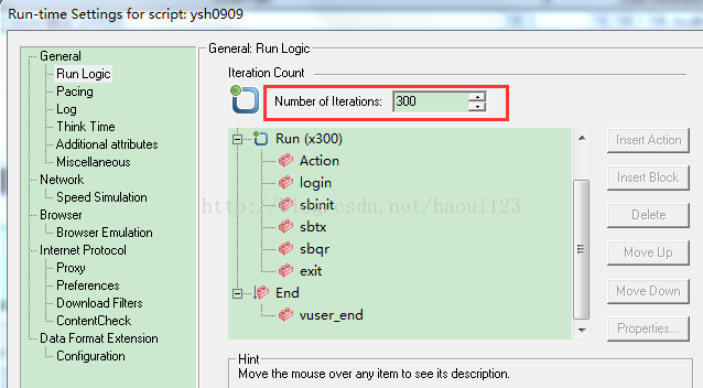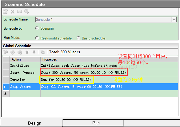 4.在Design里,设置一些其他的参数。Start Vusers是指共设置300个用户,每10秒加载50个用户。