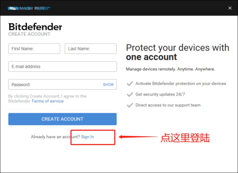 5、注册帐号登陆Bitefender 2018即可。