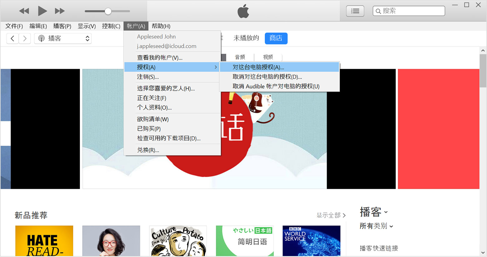 3.Windows:从 iTunes 窗口顶部的菜单栏中,选取“帐户”>“授权”>“对这台电脑授权”。如果您没有看到菜单栏,请按键盘上的 Control + B 键。